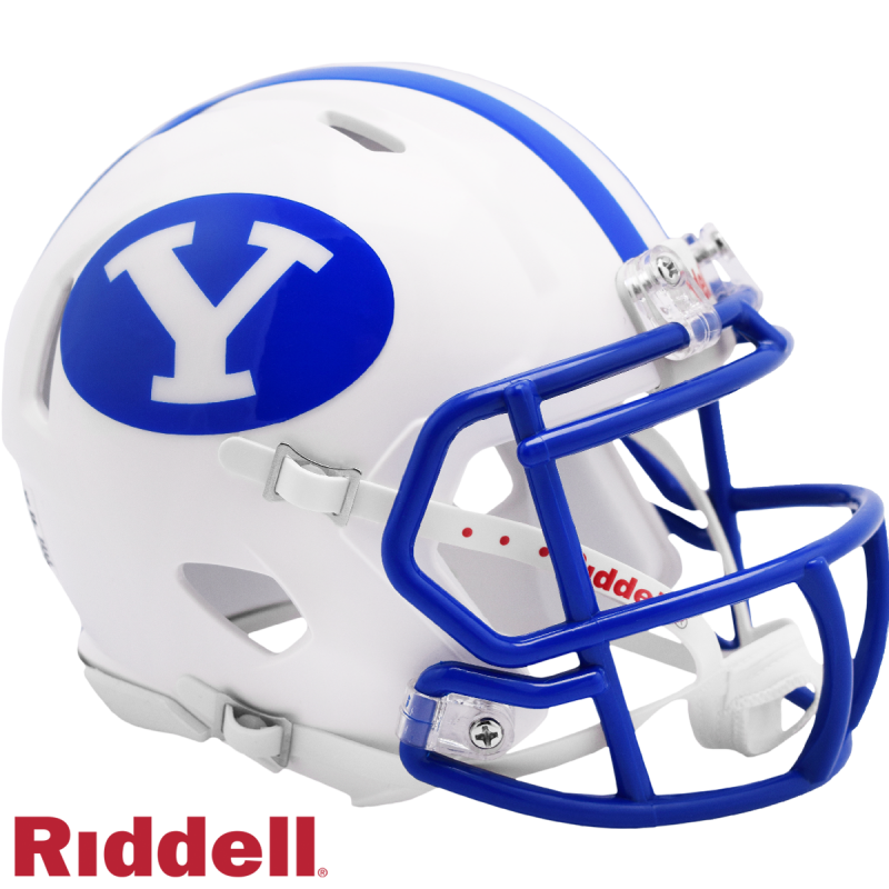 The BYU White Helmet Collection features a white shell, royal facemask, and royal Y decals with a top stripe.Also available in Speed Replica full size-allow 4-6 weeks).