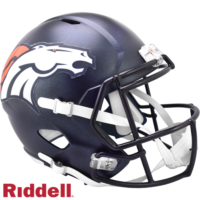 The 2024 Broncos Replica Speed Helmet by Riddell is a full size helmet replicating the helmet worn on the field by many Broncos players. Each NFL licensed helmet comes with a real facemask, interior imitation pads and a no wear plate to prevent people from putting on the helmet. The Broncos Replica Speed Helmet is a great collectible to display on any desk or shelf. The Broncos Speed helmets have become very popular on the field as the Speed model has proven to be successful in preventing concussions compared to the previous helmet models. All NFL team Replica Speed Helmets are available through National Sports Distributors and can be ordered at this link NFL Replica Speed Helmets.