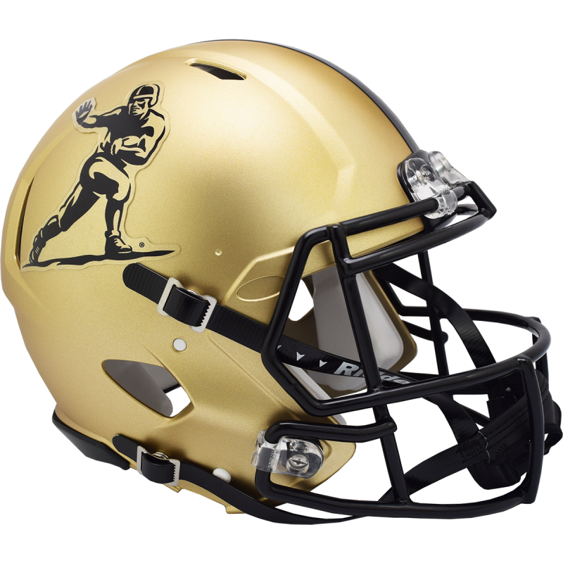 Heisman College Speed Authentic Helmet by Riddell features a low gloss gold shell, black facemask, Heisman logo side decals, Heisman front bumper decal, and black top stripe. Each Speed helmet features a very distinctive, aggressive shell design, large size shell, special order facemask and four point chin-strap. Made by Riddell.