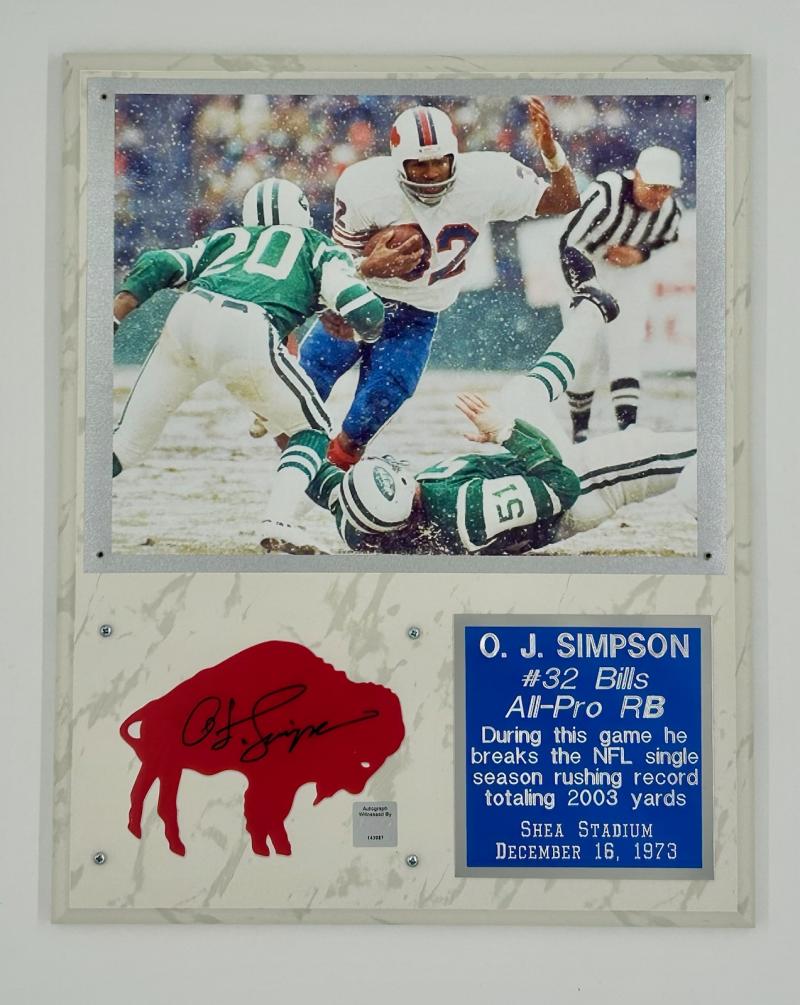 The OJ Simpson Autographed Buffalo Bills Decal was signed while he was in custody in jail. The photo is of the December 16, 1973 game where OJ broke the NFL single season rushing record totalling 2003 yards. The decal placement varies and is on the right or left side of the plaque.