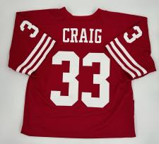 Roger Craig #33 San Francisco 49ers deluxe Red Jersey. These 49ers jerseys of retired players are of extreme high quality. Each jersey is constructed like the jersey he wore when playing in the game. The heavey red mesh material has double thickness in the shoulder pad area, a double thickness red nameplate, a longer body to tuck in nicely, American made Tackle-Twill heavy cloth white material for the sewn on letters and numbers. This jersey is based on the original Wilson body design, but with no Wilson logo.