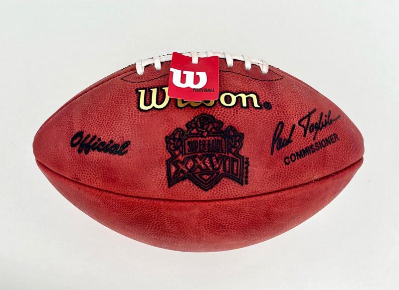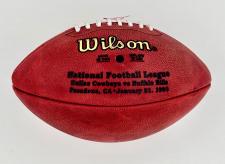 This is the Official Wilson Super Bowl XXXVII football made by Wilson. The game was played between the Cowboys and the Bills on January 31, 1993, at the Rose Bowl in Pasadena, California, and is the last NFL championship game to date to be held in a non-NFL stadium. The Cowboys defeated the Bills by the score of 52–17, winning their third Super Bowl in team history, and their first one in 15 years. Each football has the Super Bowl logo, the date, the team names and location of the game.