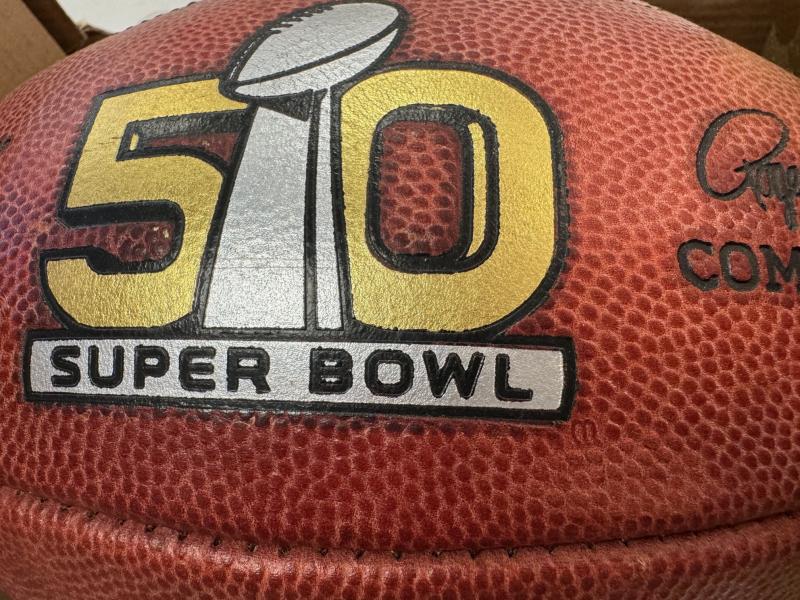 This Super Bowl 50 Duke leather football is imprinted with AFC Champion, NFC Champion, San Francisco Bay Area, February 7, 2016 and the great looking Super Bowl 50 football gold logo. The Denver Broncos won 24-10 versus the Carolina Panthers. Has the "w" stamp. This ball does not have the team names imprinted on it