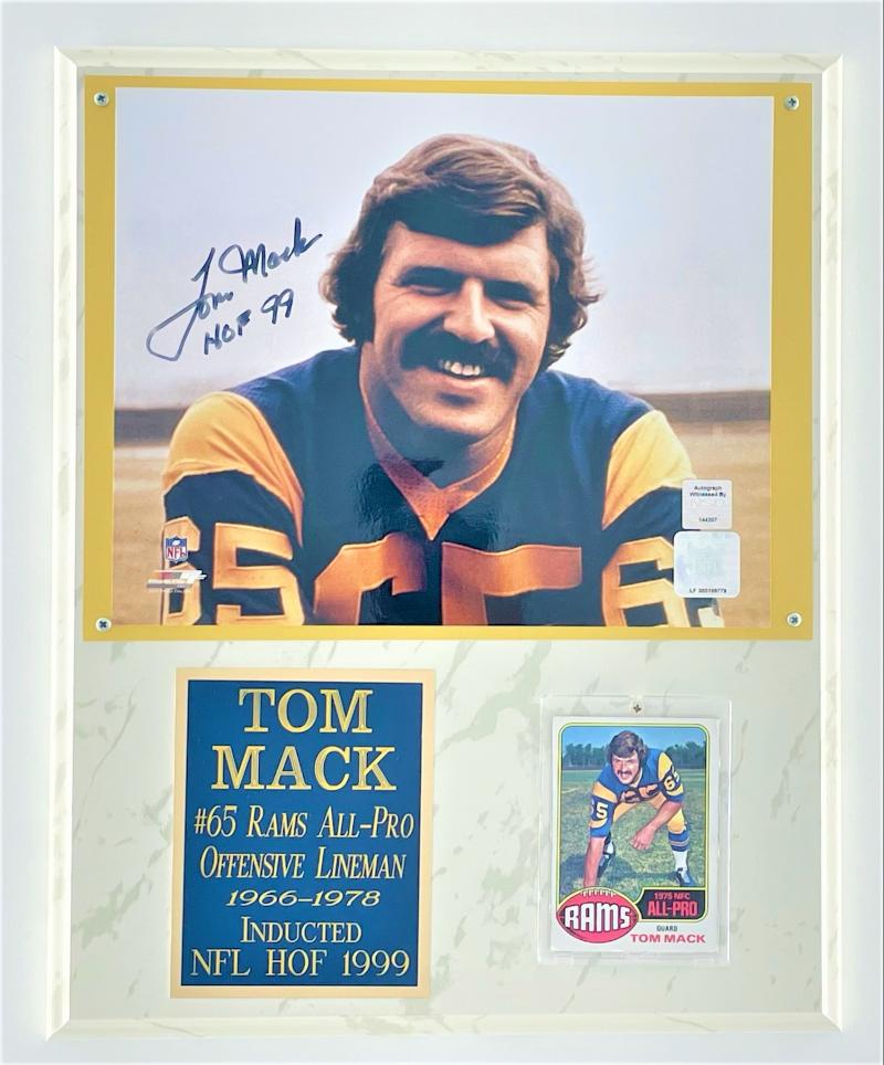 This Rams Tom Mack Autographed Plaque is 12" x 15" with a vintage 8x10 photo, a football card and a deluxe engraved plate. Tom Mack played 13 seasons of NFL Football for the Los Angeles Rams where he became one of the best offensive tackle's in NFL history. Mack played college football at the University of Michigan where he played both Tackle and Defensive end. Mack had a lot to do with Michigan's success, as they would win the Big 10 Championship in 1964 and defeated Oregon State in the Rose Bowl in 1965. He would be selected #2 overall in the 1966 NFL draft by the Rams. Through his 13 seasons, Mack never missed a single game for the Rams during his career. This longetivity helped Mack make 11 Pro Bowls in his career, along with being selected to both the All-Pro First Team and Second Team 4 times each. During Mack's career, he helped the Rams to a dominant winning record that saw the Rams win the NFC West division 8 times and make the NFC Championship game 4 times, but could never make it to the Super Bowl. Mack retired in 1978 from the game of football and would be enshrined in both Michigan's Athletic Hall of Honor and the Pro Football Hall of Fame.