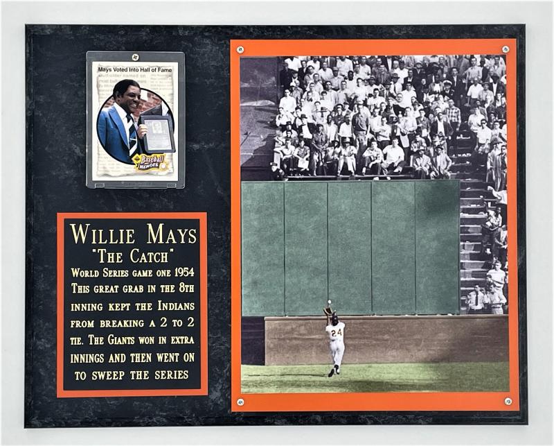 The Willie Mays baseball card will vary due to availability but the 8x10 photo of "The Catch" and the deluxe engraved plate will be as pictured.
